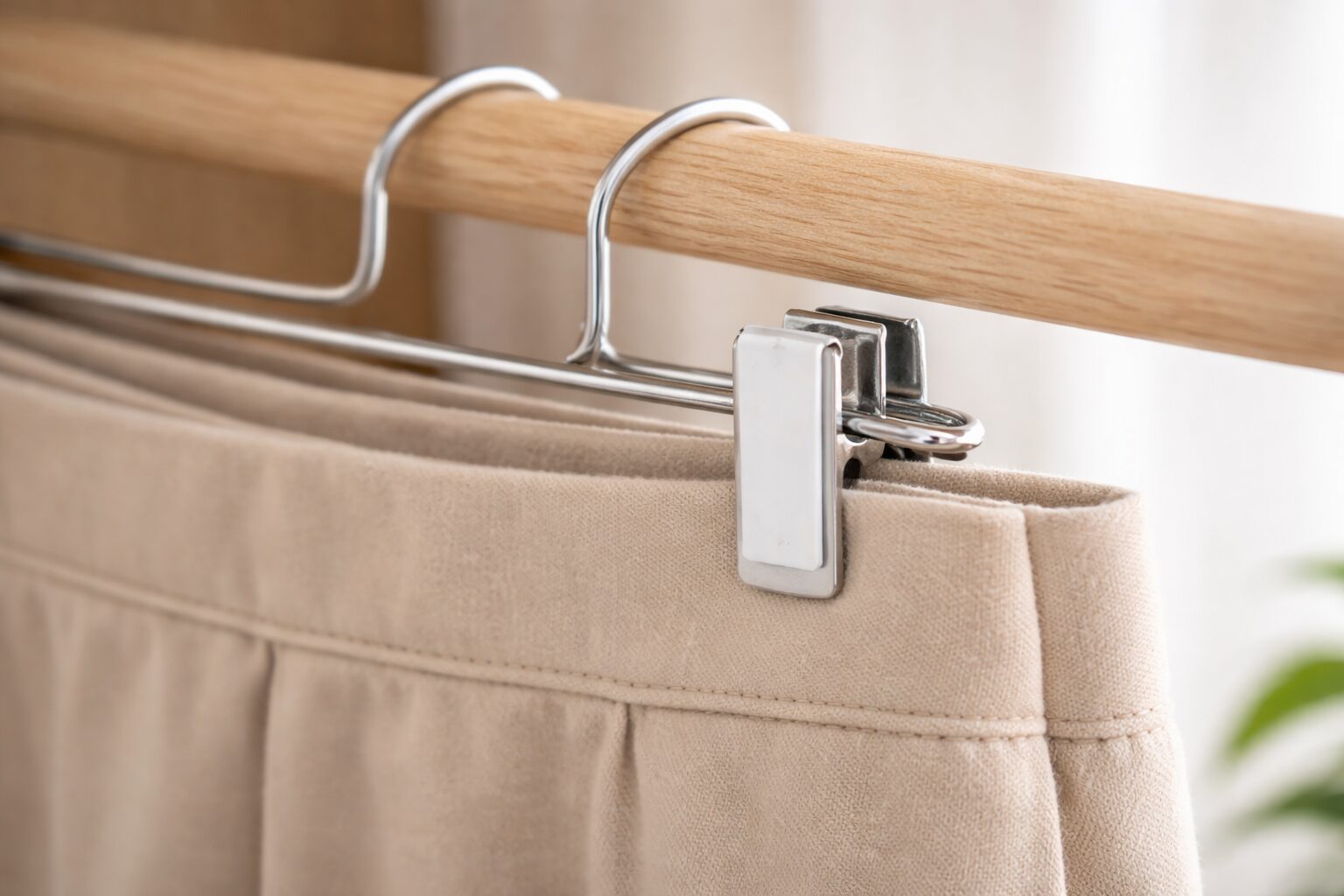 パンツはノンスリップバー、スカートはカバー付きクリップを使うと跡が残りにくくなります。